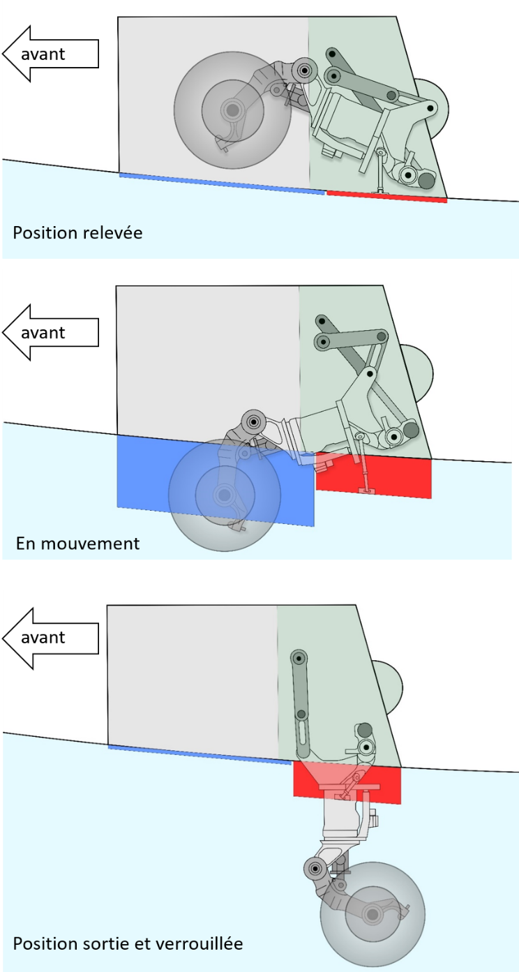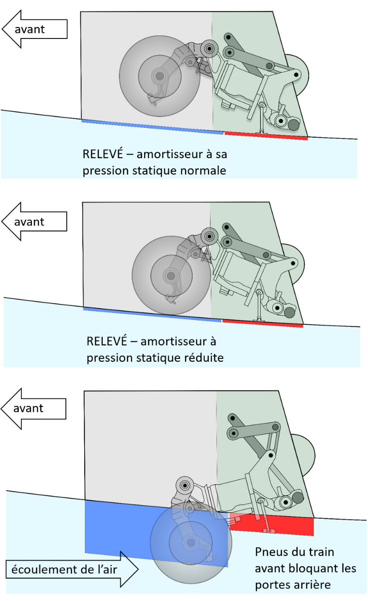 - L’écoulement aérodynamique en vol a compressé davantage la jambe à amortisseur lors de la sortie du train avant, poussant les pneus en travers des portes arrière du train d’atterrissage et coinçant ainsi le train avant en position partiellement sortie.