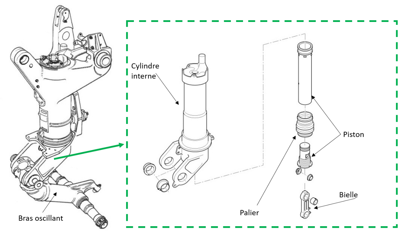Les composants de l’ensemble cylindre interne et piston absorbent l’impact de l’atterrissage. Cet ensemble est rempli de liquide hydraulique et d’azote gazeux. Le bras oscillant pivote autour de la patte de fixation du cylindre interne et est raccordé par une bielle au piston, qui va et vient dans le cylindre interne. Le piston glisse dans un palier monté à l’intérieur de l’alésage inférieur de ce cylindreNote de bas de page 11.
