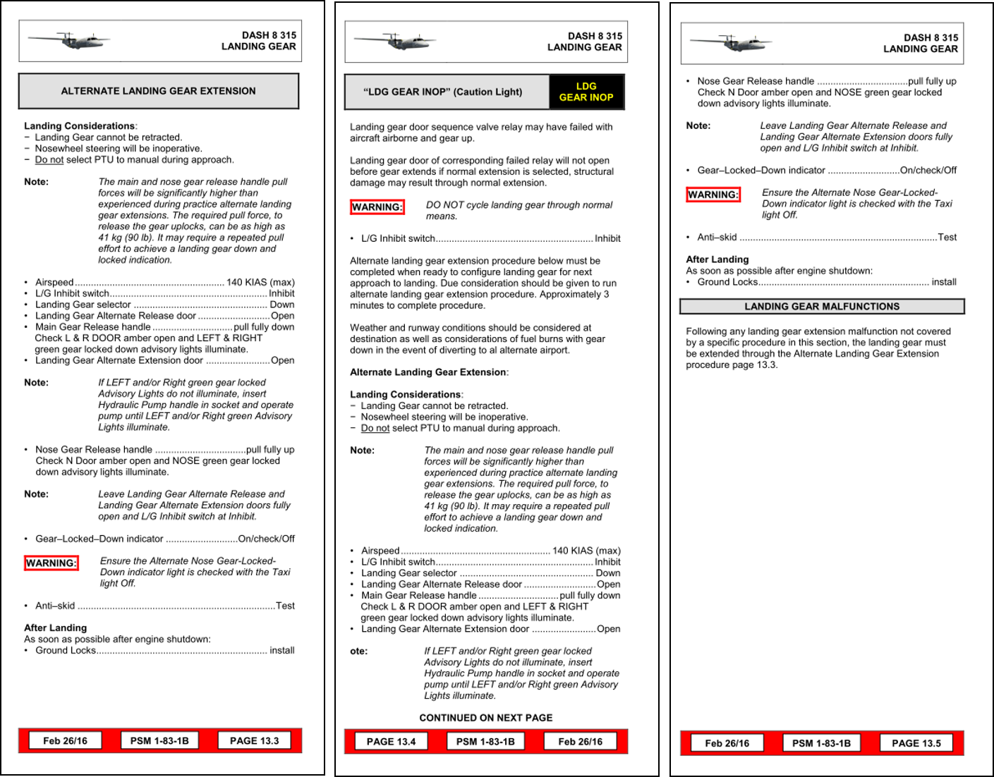 Annexe B – Manuel de référence rapide pour l’avion Dash 8 – Listes de vérification ALTERNATE LANDING GEAR EXTENSION (circuit de secours de sortie du train d’atterrissage) et LDG GEAR INOP (train d’atterrissage non fonctionnel)