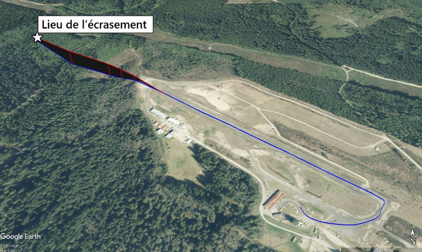 Figure 1. Trajectoire de vol de l'aéronef en cause dans l'événement à l'étude, établie par système mondial de positionnement pour navigation satellite, vue du sud (Source : Google Earth, avec annotations du BST)