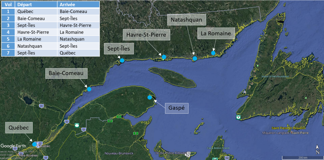 Le 26 février 2018, les 2 pilotes formant l’équipage du Beechcraft King Air A100 (immatriculation C-GJXF, numéro de série B-159) exploité par Strait Air (2000) Ltd. (Strait Air) sont arrivés à l’aéroport international de Québec/Jean Lesage (CYQB) (Québec) pour leur journée de travail, qui débutait à 6 hNote de bas de page 7 . Ils devaient effectuer cette journée-là une série de 7 vols nolisésNote de bas de page 8 (figure 1). Le départ du premier vol de CYQB était prévu à 7 h 10 et le retour du dernier vol à CYQB en fin de journée, à 18 h.