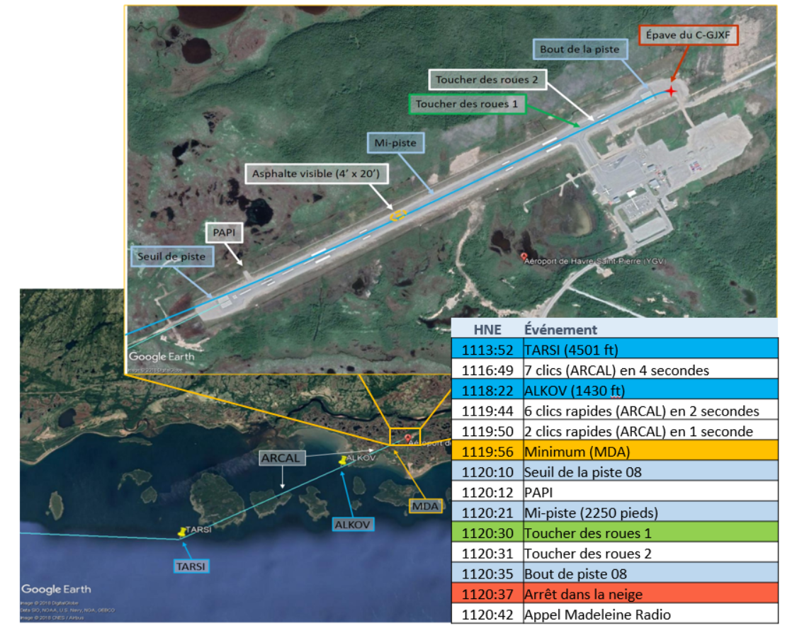 Le 26 février 2018, un Beechcraft King Air A100 (immatriculation C-GJXF, numéro de série B-159) exploité par Strait Air (2000) Ltd. effectuait le vol nolisé NUK107 selon les règles de vol aux instruments en provenance de l’aéroport de Sept-Îles (Québec) à destination de l’aéroport de Havre-Saint-Pierre (Québec), avec 2 membres d’équipage et 6 passagers à bord. Alors que les conditions de visibilité étaient réduites en raison de fortes averses de neige, l’aéronef a effectué une approche vers la piste 08, qui était enneigée, et s’est posé environ 3800 pieds après le seuil, soit à environ 700 pieds de l’extrémité de la piste. Il a continué sa course à l’atterrissage au-delà de la piste, pour finalement aller s’immobiliser dans un banc de neige, à environ 220 pieds au-delà de l’extrémité de la piste. L’accident s’est produit de jour, à 11 h 20, heure normale de l’Est. La radiobalise de repérage d’urgence émettant sur 406 MHz ne s’est pas déclenchée suite à l’événement. L’appareil a subi des dommages importants. Il y a eu 4 blessés légers.