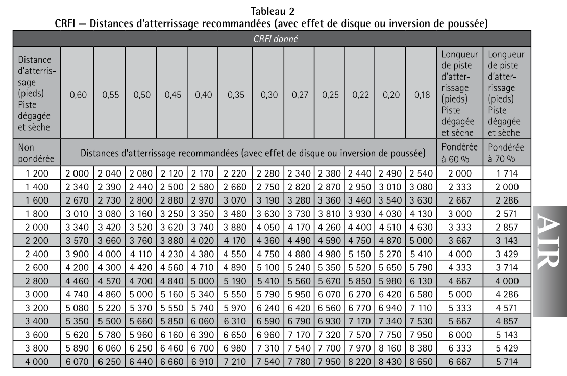 Les données disponibles dans le manuel de vol de l’aéronef (AFM) Note de bas de page 14 ont servi à calculer les distances d’atterrissage sur piste sèche, pour pouvoir ensuite déterminer les distances recommandées pour les conditions de piste contaminée par de la neige et ayant un CRFI de 0,38 (tableau 4). Les distances recommandées en fonction du CRFI sont publiées dans le Manuel d’information aéronautique de Transports Canada (AIM de TC) Note de bas de page 15 et sont disponibles jusqu’à un CRFI minimal de 0,18 (annexe B).