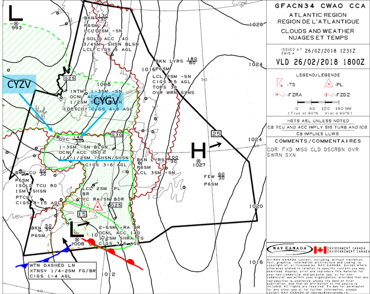 | SPECI CYGV 261716Z AUTO 14004KT 3/4SM -SN BKN009 OVC013 M02/M03 A2980 RMK | Aux minimums |