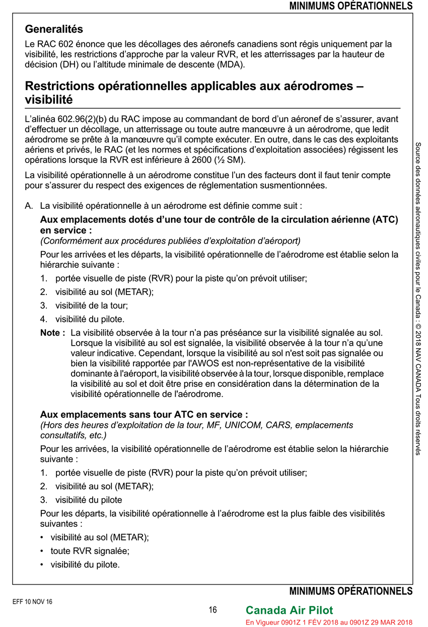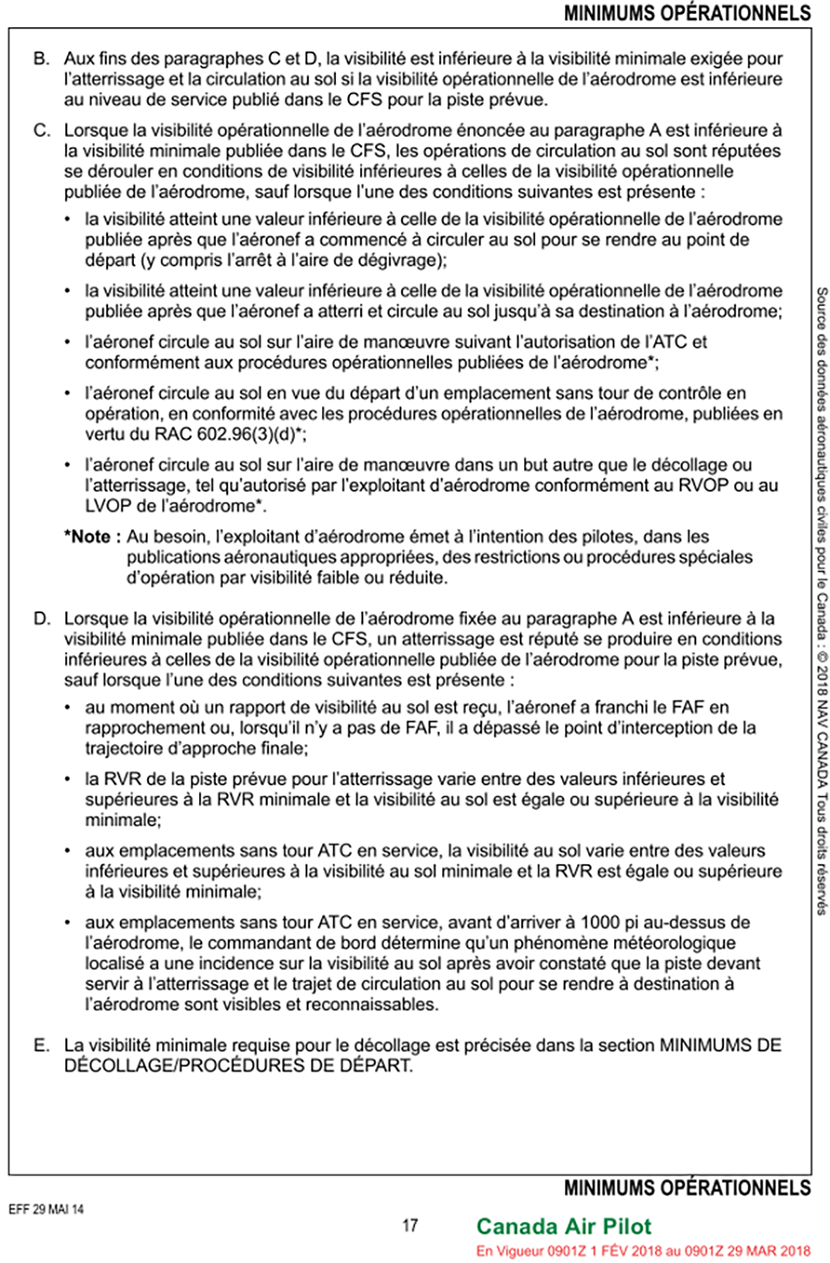 Pour déterminer s’il est possible d’atterrir en toute légalité à un aérodrome au Canada, il faut d’abord vérifier les restrictions opérationnelles qui s’appliquent à l’aérodrome concerné pour s’assurer que cet aérodrome convient à la manœuvre à exécuterNote de bas de page 115 . Un des facteurs déterminants est la visibilité opérationnelle d’aérodrome, qui est définie dans la partie portant sur les minimums opérationnelsNote de bas de page 116 de la section Généralités du volume 6 du Canada Air Pilot (CAP). Cette visibilité opérationnelle minimale est publiée dans le Supplément de vol – Canada (CFS), et plus précisément dans le champ réservé à l’information sur les pistes. Si la visibilité opérationnelle d’aérodrome n’est pas publiée dans le CFS, cela signifie que les opérations ne sont pas autorisées quand la visibilité est inférieure à ½ mille terrestre (SM).