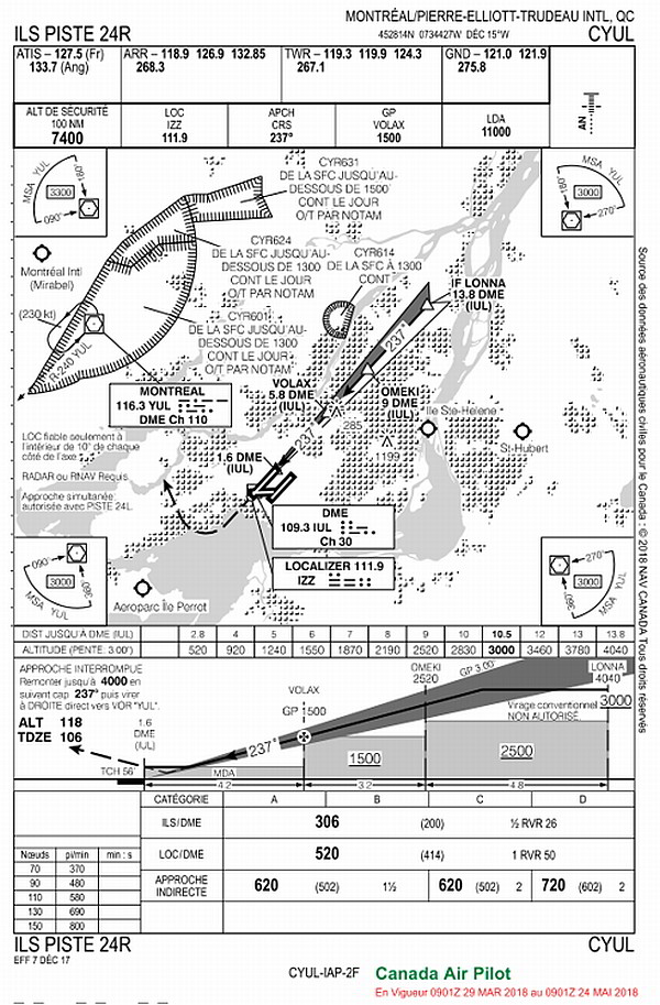 Source : NAV CANADA, Canada Air Pilot (en vigueur du 29 mars 2018 au 24 mai 2018) CAP 6 : Québec.