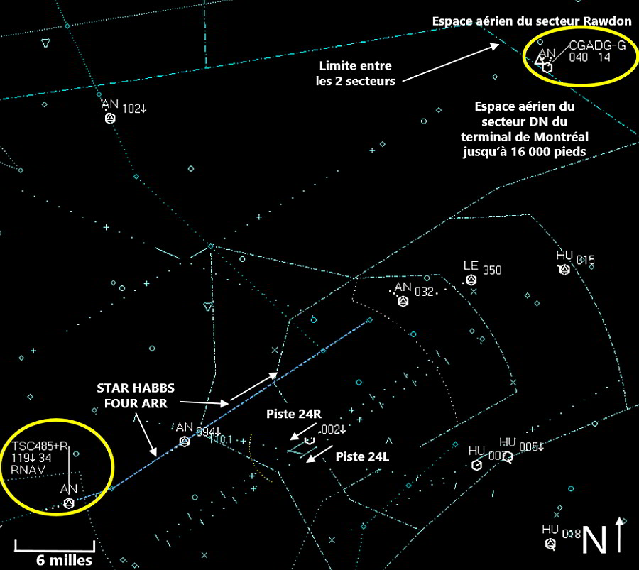L'ACC de Montréal régit l'espace aérien contrôlé dans un secteur défini dans le document Manuel d'exploitation ACC de Montréal. Ce secteur est divisé en plusieurs sous-unités, y compris la sous-unité terminale de Montréal, elle-même divisée en secteurs AN, AS, LO, DN, DS et SA Note de bas de page 22.
