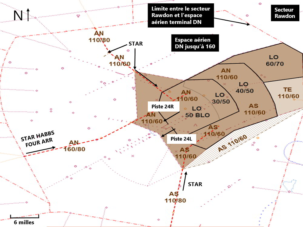 Au moment de l'événement, on avait consolidé le contrôle de certains des 6 secteurs, qui étaient couverts par 3 postes de contrôleur (figure 4). Le contrôleur AN était responsable des aéronefs en arrivée normalisée en région terminale (STAR) et dans l'espace aérien au-dessus de certaines zones du secteur LO à des altitudes allant de 11 000 pieds à 6000 pieds (indiqué par « 110/60 » à la figure 4). Le contrôleur LO était responsable des aéronefs en approche vers l'aéroport et volant à une altitude d'au plus 7000 pieds dans le secteur LO. Le contrôleur DN était responsable des aéronefs qui volaient dans tout le reste de l'espace aérien contrôlé par la sous-unité terminale de Montréal, y compris les aéronefs en transit dans l'espace aérien au nord-nord-est de l'aéroport à des altitudes atteignant 16 000 pieds (« Espace aérien DN jusqu'à 160 » à la figure 4) et qui n'étaient pas attribués aux contrôleurs AN et LO. Le secteur Rawdon a la responsabilité de l'espace aérien au nord-est de l'aéroport, au-delà de l'espace aérien terminal de Montréal.