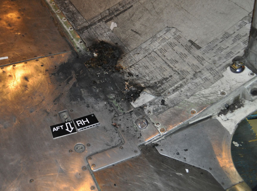 Un bagage, retrouvé face à plat au sol près de la porte de soute, était visiblement endommagé par le feu (figure 1).