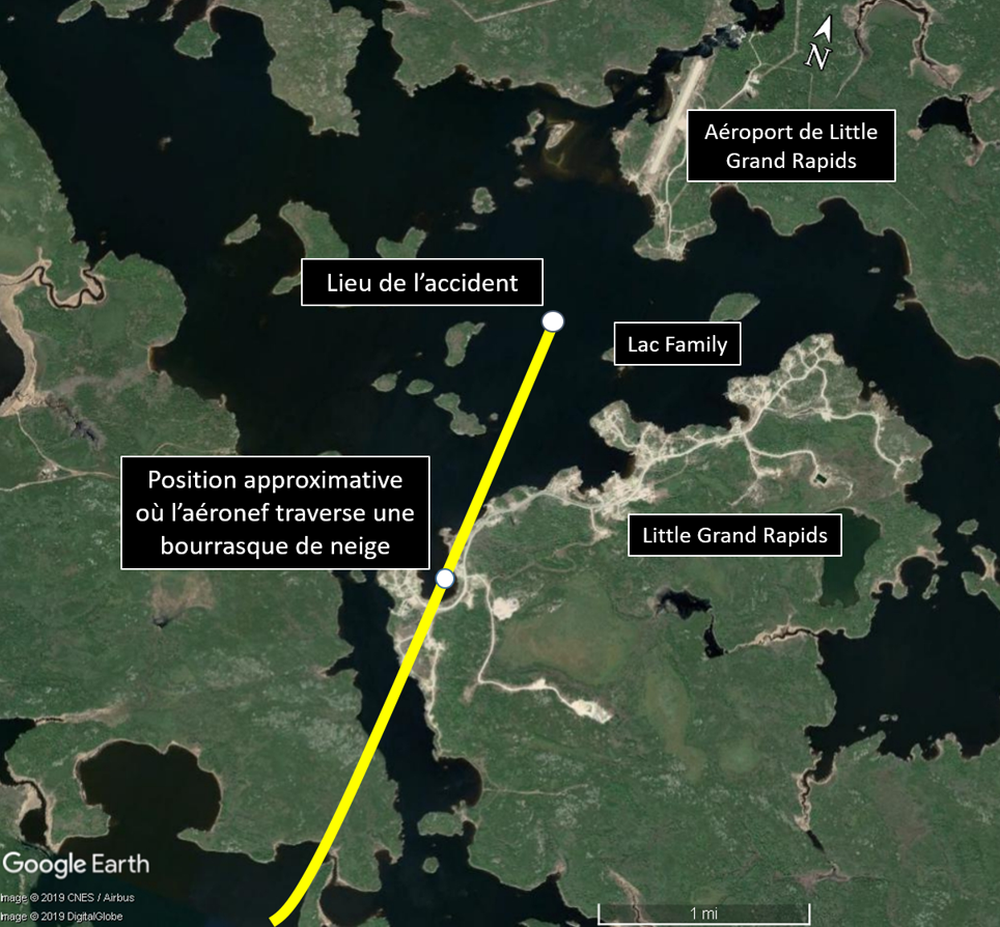 Durant le vol sur une distance de 133 milles marins (nm), l'avion a traversé plusieurs bourrasques de neige qui ont réduit la visibilité en vol à quelque 3 nm. Le pilote a choisi de poursuivre le vol dans ces zones de bourrasques de neigeNote de bas de page 2. Dans les zones qui n'étaient pas touchées par ces bourrasques, on a fait état de conditions météorologiques offrant une bonne visibilité et un ciel dégagé.
