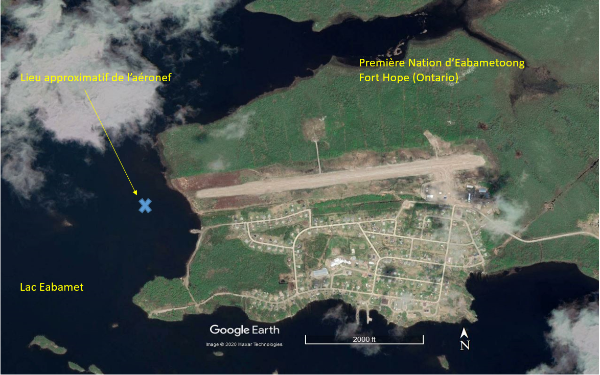 Vers 1 h 40, l’aéronef a décollé de CYFH. Le premier officier était le pilote aux commandes (PF), assis dans le siège droit, et le commandant de bord était le pilote qui n’est pas aux commandes (PNF), assis dans le siège gauche. Peu après le décollage, le PF a demandé à ce que le train d’atterrissage soit rentré. Le PNF a demandé à ce que le train d’atterrissage soit rentré à environ 200 pieds au-dessus du sol (AGL). Les 2 moteurs ont ensuite connu une perte de puissance simultanée et l’équipage de conduite a effectué un amerrissage forcé sur le lac Eabamet (Ontario), dans l’obscurité totale (figure 1).