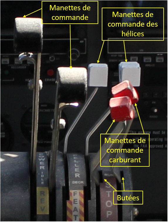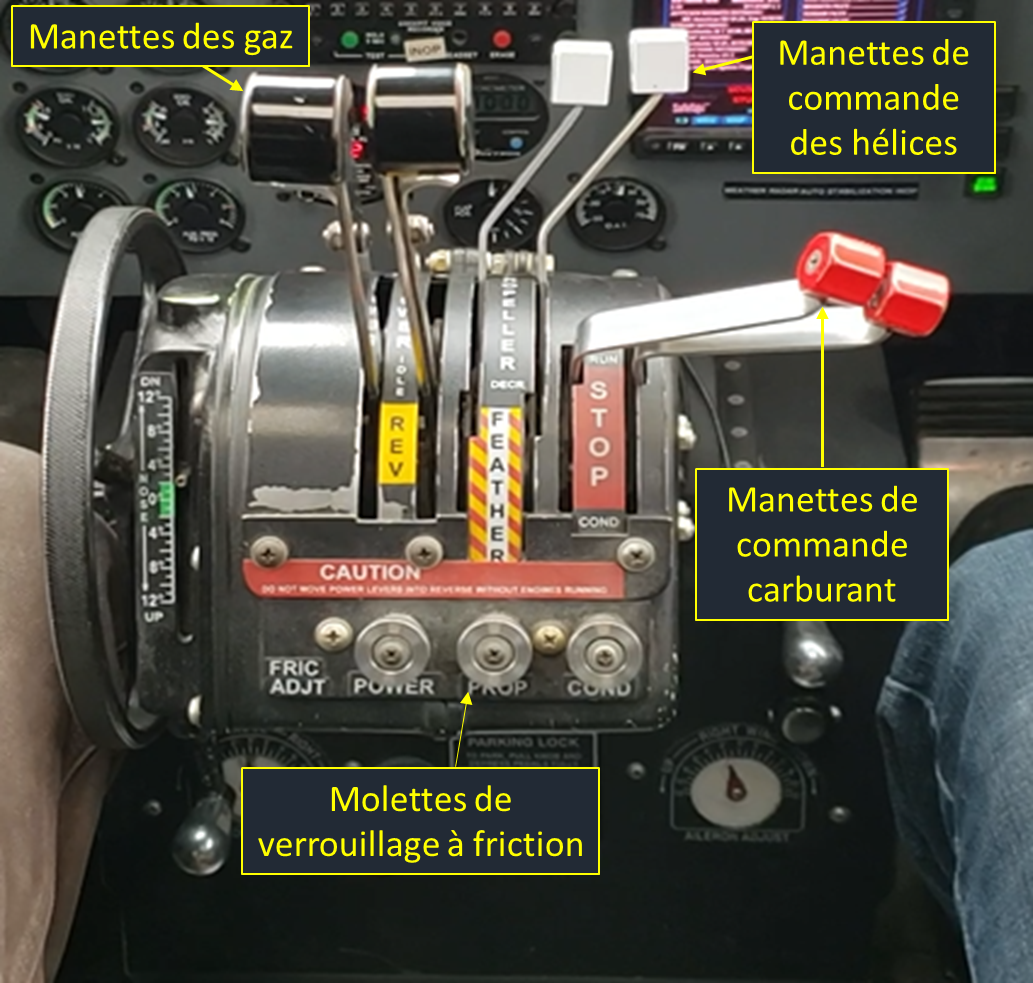 Le bloc manette consiste en des manettes des gaz, des manettes de commande des hélices, des manettes de commande carburant et des molettes de verrouillage à friction (figure 2).