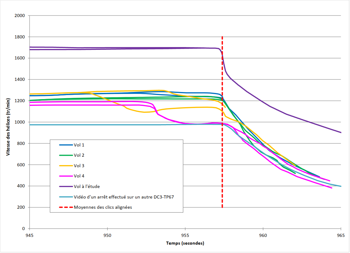 L’analyse des signatures acoustiques indique qu’au moment où on a entendu les clics pendant les arrêts normaux des moteurs, il y a eu une réduction immédiate de la vitesse des hélices. Ce phénomène a également été observé dans la vidéo de l’arrêt des moteurs sur un autre aéronef DC3-TP67 exploité par North Star Air ltée (North Star Air).