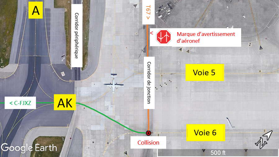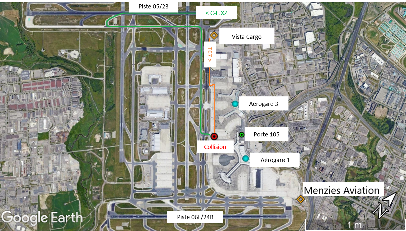 À 1 h 26 le 10 mai 2019, l’aéronef a atterri sur la piste 23. Après avoir quitté la piste 23 pour rejoindre la voie de circulation H2, l’équipage de conduite a mis en drapeauNote de bas de page 2 l’hélice gauche conformément à la vérification après atterrissageNote de bas de page 3. L’équipage de conduite a reçu les instructions de roulage et a emprunté les voies de circulation H, B, et AK (Figure 1). Sur la voie de circulation AK, le premier officier (P/O) a contacté le service de gestion de l’aire de trafic et a reçu l’instruction de suivre la voie 6 jusqu’à la porte 105 de l’aérogare 1. Cela a eu lieu environ 10 secondes avant la collision.