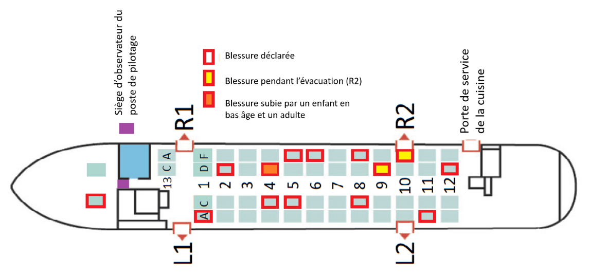 Deux de ces blessures sont survenues pendant l’évacuation, à la suite d’un saut par le hublot issue de secours arrière droit (issue R2) (Figure 4).