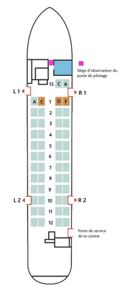 Les hublots issues de secours arrière, désignés L2 et R2, sont plus petits que les issues L1 et R1, et leur seuil se situe à environ 23 pouces du plancher de la cabine et à environ 65 pouces au-dessus du niveau du sol. La porte de service de la cuisine située derrière la rangée 12 du côté droit de l’aéronef n’est pas considérée comme une issue de secours, mais peut être utilisée comme moyen d’évacuation en dernier recours.Note de bas de page 10