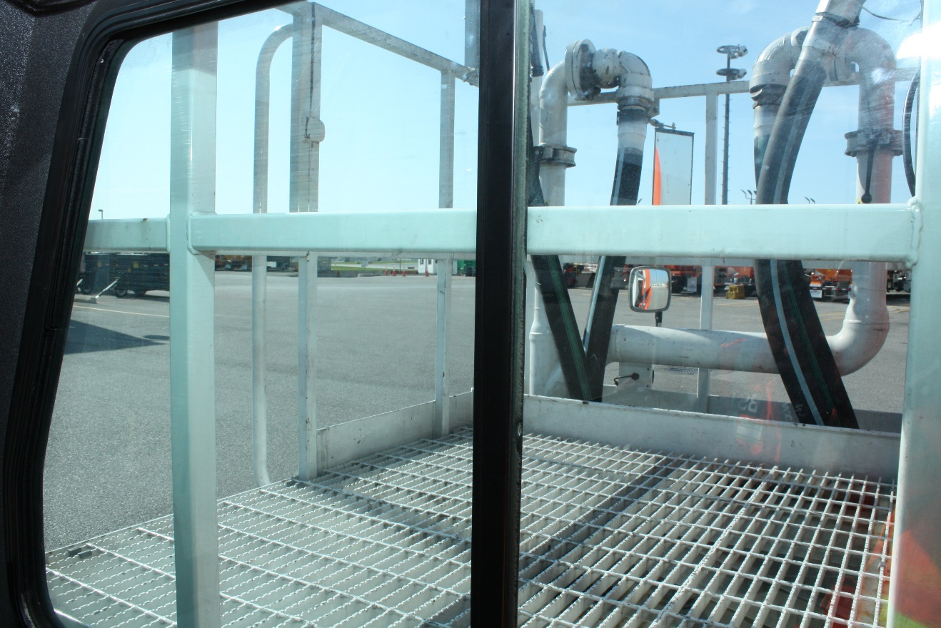 L’opérateur accède à la plate-forme par l’avant en empruntant une porte qui doit être fermée pendant les opérations d’avitaillement en carburant. Pendant l’avitaillement, l’opérateur occupe la plate-forme et la soulève au besoin pour accéder à l’orifice du réservoir de carburant de l’aéronef. Lorsque l’avitaillement est terminé, la plate-forme doit être abaissée à sa position la plus basse, ce qui enclenche un micro-interrupteur permettant la conduite du camion.