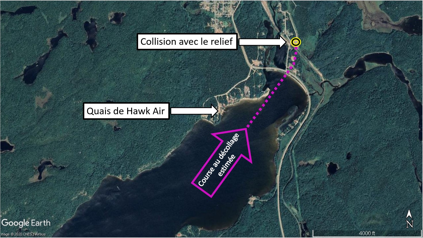 Vers 8 h 52, l’aéronef a commencé sa course au décollage. Il a pris son envol environ par le travers du quai de Hawk Air (figure 1) et est monté à une hauteur estimative de 300 à 400 pieds au-dessus du sol (AGL). L’aéronef a été vu en train de monter normalement avant d’entamer un virage soudain à gauche et une assiette en piqué extrême.
