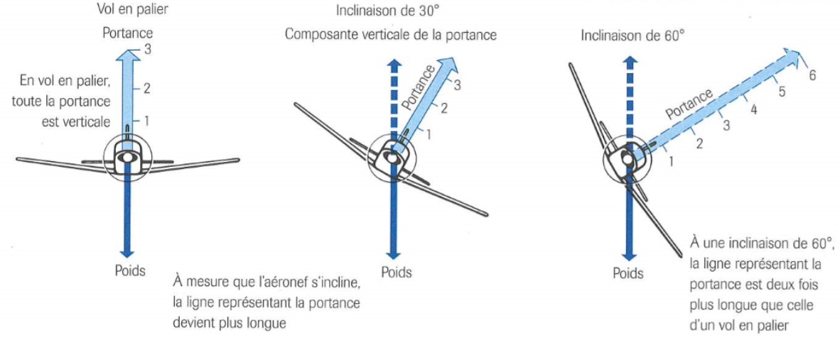 En vol rectiligne en palier, la portance et le poids sont égaux et le facteur de charge est de 1. Afin de maintenir le vol en palier lorsqu’un aéronef est incliné, l’élément vertical de la portance doit être accru pour égaler le poids de l’aéronef; pour ce faire, il faut augmenter l’angle d’attaque de l’aile en tirant sur la commande de profondeur afin de maintenir l’altitude (figure 4).