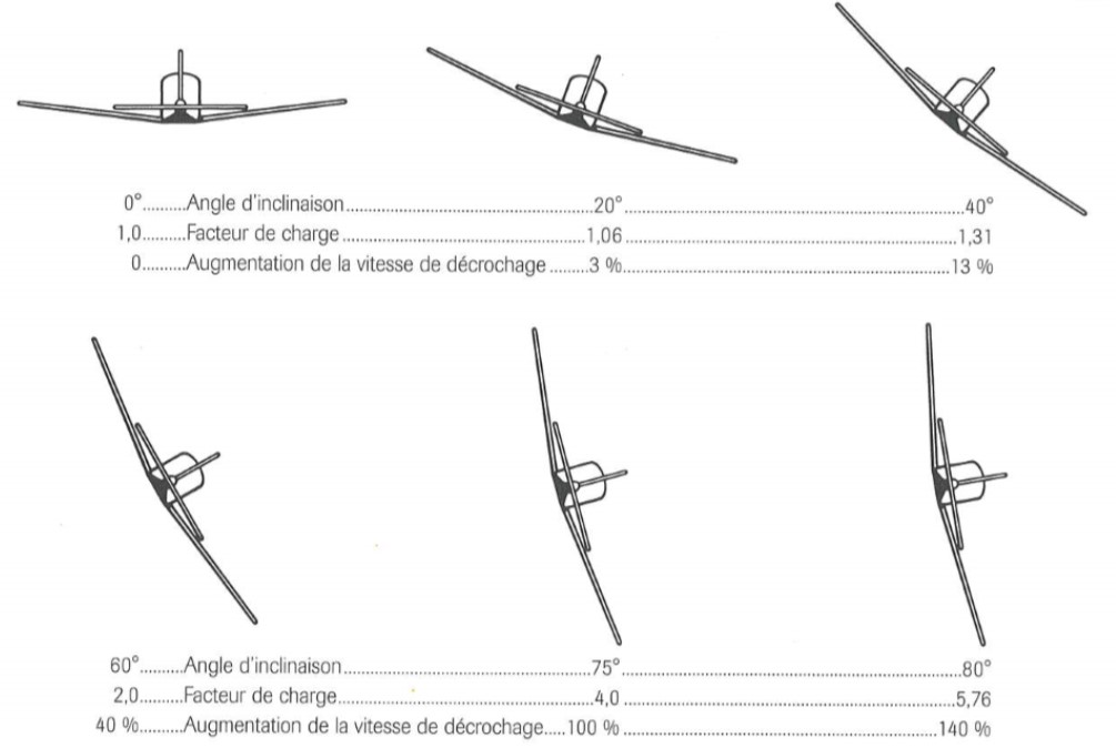 En augmentant l’angle de l’inclinaison, le facteur de charge et la vitesse de décrochage de l’aéronef augmentent aussi, puisque l’aéronef fonctionne comme s’il était plus lourd. À un angle d’inclinaison de 60°, le facteur de charge est de 2, ce qui signifie que l’aéronef a un rendement équivalent à s’il était deux fois plus lourd en palier. La vitesse de décrochage augmente de 40 % à un angle d’inclinaison de 60° (figure 5).