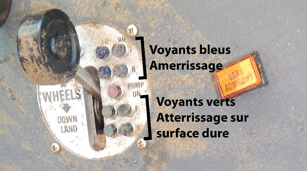 L’avion comprenait 8 voyants indépendants de position de train d’atterrissage (figure 2) divisés en 2 groupes : 4 voyants bleus pour un amerrissage et 4 voyants verts pour un atterrissage sur surface dure. Normalement, chaque voyant des 2 groupes de couleur est associé à une des 4 roues du train d’atterrissage : les 2 du haut pour le train d’atterrissage avant et les 2 du bas pour le train d’atterrissage principal. Les voyants bleus s’illuminent pour indiquer que le train d’atterrissage est remonté pour un amerrissage, et les voyants verts s’illuminent pour indiquer que le train d’atterrissage est descendu pour un atterrissage sur une surface dure.