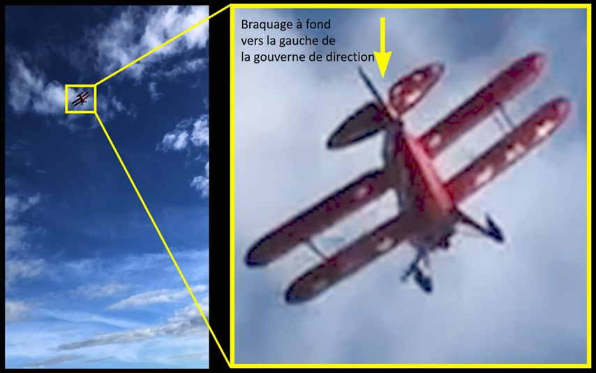Les vidéos ont également permis d’observer que le virage vers la gauche était en dérapage pendant environ 3 secondes (virage non coordonné). Ce genre de dérapage indique en général une mauvaise coordination des commandes de vol (par exemple, trop de pression sur le palonnier dans le sens du virage). Sur des captures d’images tirées des vidéos, il est possible de voir la position de la gouverne de direction, qui était braquée au maximum à gauche lors du virage (figure 2). Il n’a toutefois pas été possible de déterminer la position des ailerons.