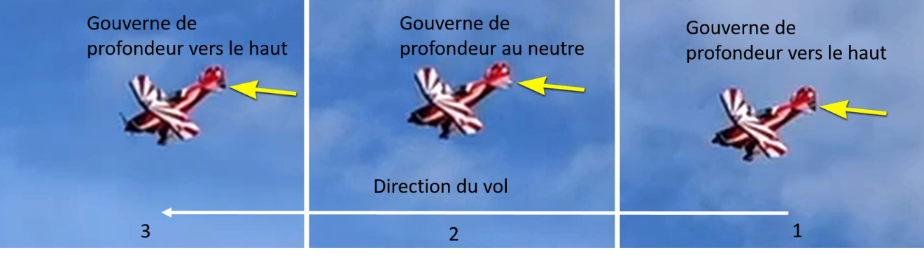 À la suite du braquage à fond de la gouverne de direction, l’angle d’inclinaison est passé de 22° à 88° sur la gauche. L’aéronef était alors à 351 pieds AGL et évoluait à une vitesse de 65 nœuds, soit à une vitesse inférieure à la vitesse de décrochage lors d’un virage à 60° d’inclinaison. L’aéronef a décroché et a perdu de l’altitude rapidement. L’inclinaison à gauche a été réduite progressivement pour atteindre 29° lorsque l’aéronef était à 122 pieds AGL. À ce moment-là, l’aéronef était à une vitesse de 72 nœuds et en position de piqué selon un angle de 24°. La vidéo a permis de constater que, lors de la descente, la gouverne de profondeur a été ramenée à la position vers le haut à 2 reprises (figure 3), ce qui indique qu’une tentative a été faite pour redresser l’appareil avant l’impact.