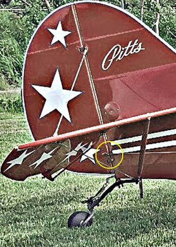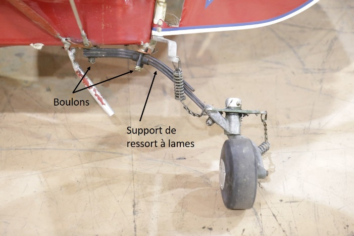 La roulette de queue est fixée à un ressort à lames lui-même fixé au fuselage par 2 boulons (figure 5). L’examen a permis de constater une rupture du boulon arrière du ressort à lames. Cette rupture permettait au ressort à lames de pivoter en arc autour du boulon avant. Il n’a pu être déterminé si cette rupture était survenue avant ou après l’impact. Toutefois, l’examen de l’assemblage de la roulette de queue a révélé que son déplacement maximal dans une direction ou l’autre ne pouvait pas gêner le déplacement de la gouverne de direction.