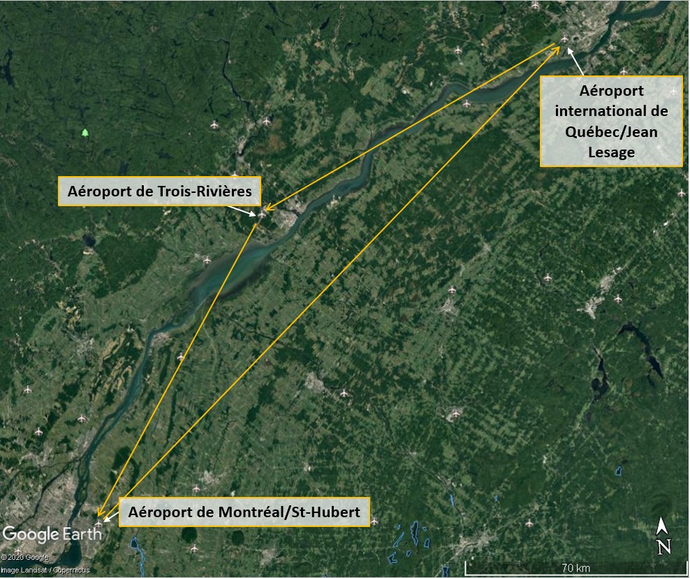 Le départ de l’aéroport de Montréal/St-Hubert (CYHU) (Québec) était prévu à 22 h 30Note de bas de page 3. Le trajet comprenait une approche suivie d’une remontée à l’aéroport international de Québec/Jean Lesage (CYQB) (Québec) et à l’aéroport de Trois-Rivières (CYRQ) (Québec), avant que l’aéronef revienne se poser à CYHU (figure 1).