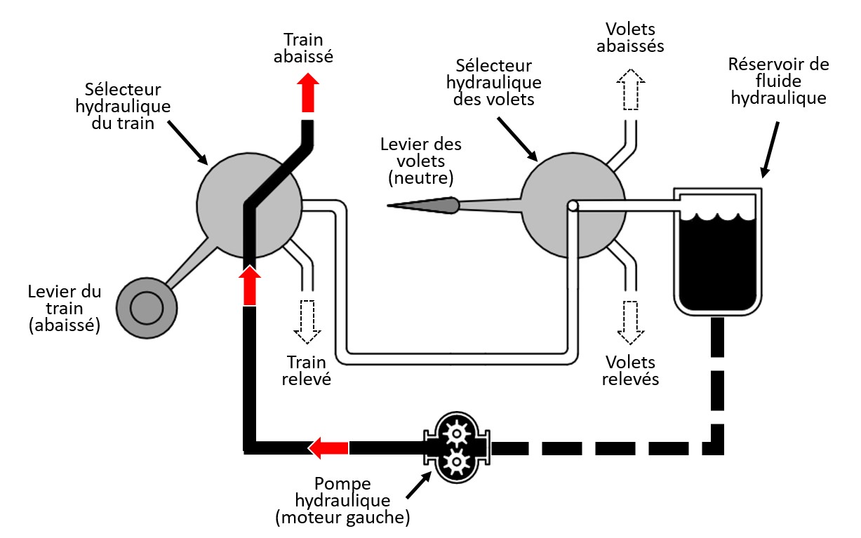 Lors de l’approche finale, le levier du train d’atterrissage a été abaissé à la position DOWN, mais il n’est pas revenu automatiquement à la position centrale, une fois le train d’atterrissage abaissé et verrouillé. Puisque le train d’atterrissage a la priorité hydraulique sur les volets, tant que le levier du train n’est pas revenu à la position centrale, le déplacement du levier des volets n’aura aucun effet, car aucune pression hydraulique ne sera acheminée aux volets (annexe B).