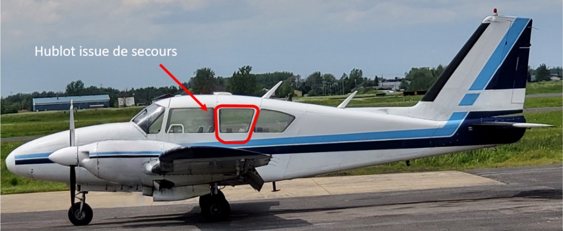 Un hublot issue de secours est situé derrière le siège du pilote côté gauche (figure 5). Le panneau est scellé contre les intempéries lorsqu’il est installé, et il ne doit être retiré qu’en cas d’urgence.