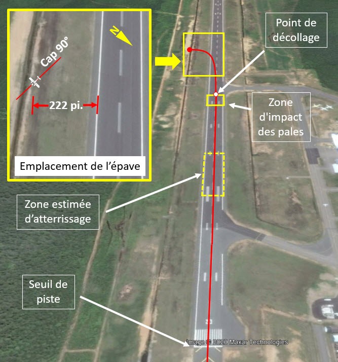 À 0 h 08 min 18 s, à une vitesse d’environ 90 mi/h, les hélices des 2 moteurs sont entrées en contact avec la surface de la piste, causant un bruit fort inhabituel, des dommages aux hélices et des vibrations importantes. L’aéronef s’est cabré, a décollé à basse vitesse avec les hélices endommagées et a amorcé un virage à gauche malgré les tentatives du pilote de maintenir le cap de piste avec la déflexion maximale des commandes de vol (ailerons et palonnier). Quelques secondes plus tard, à 0 h 09, le pilote a perdu la maîtrise de l’aéronef, qui a percuté le sol à quelque 222 pieds au sud de la piste 23 (annexe A).
