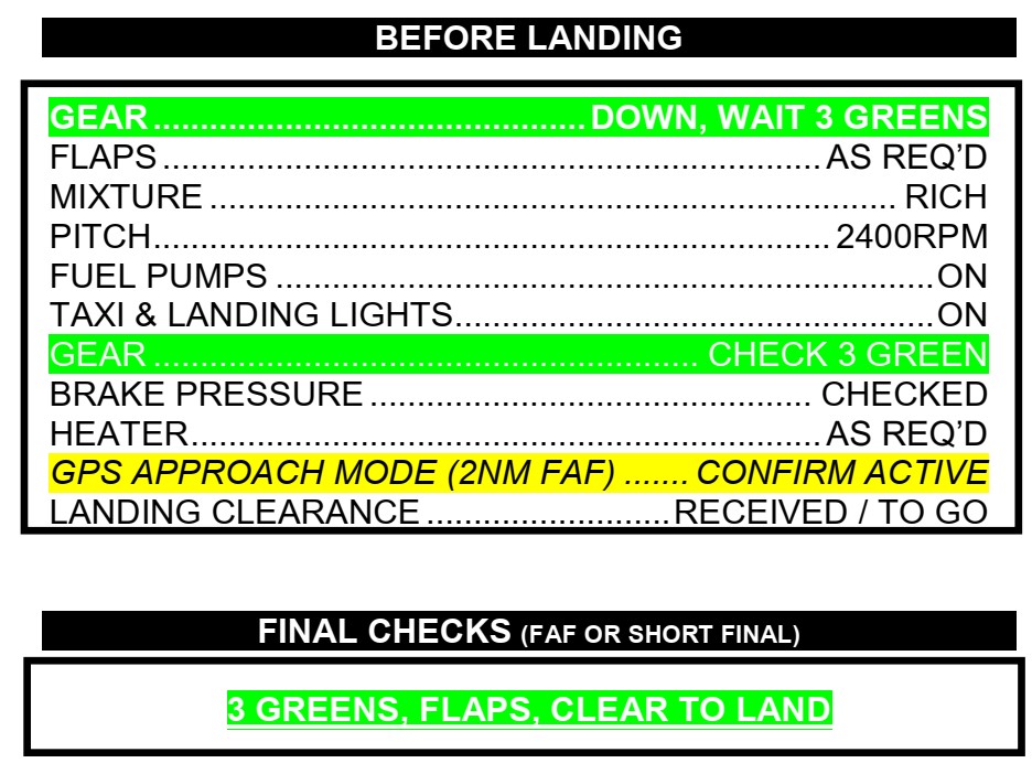 - La liste de vérification Before Landing (avant l’atterrissage) a été modifiée par l’ajout de la mention « HANDLE NEUTRAL » (levier à la position centrale) après « GEAR […] DOWN, WAIT 3 GREENS ».