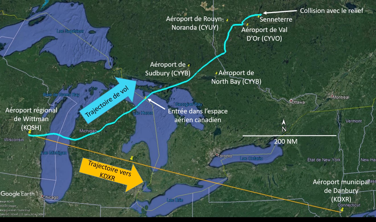 Le 29 juillet 2019, à 15 h 55, heure avancée de l’Est, l’aéronef Beechcraft Bonanza V35B (immatriculation N3804X, numéro de série D-10358) a décollé de l’aéroport régional de Wittman, au Wisconsin (États-Unis), pour un vol de jour selon les règles de vol à vue à destination de l’aéroport municipal de Danbury, au Connecticut (États-Unis), avec seulement le pilote à bord. Peu après le décollage, l’aéronef a commencé à dévier de la trajectoire prévue vers le nord et, par la suite, est entré dans l’espace aérien canadien. À 19 h 12, alors qu’il se trouvait près d’un front d’averses de pluie, d’orages et d’éclairs, l’aéronef a effectué un virage à droite, il est descendu rapidement et a percuté le relief à environ 7 milles marins au nord-est de Senneterre (Québec).