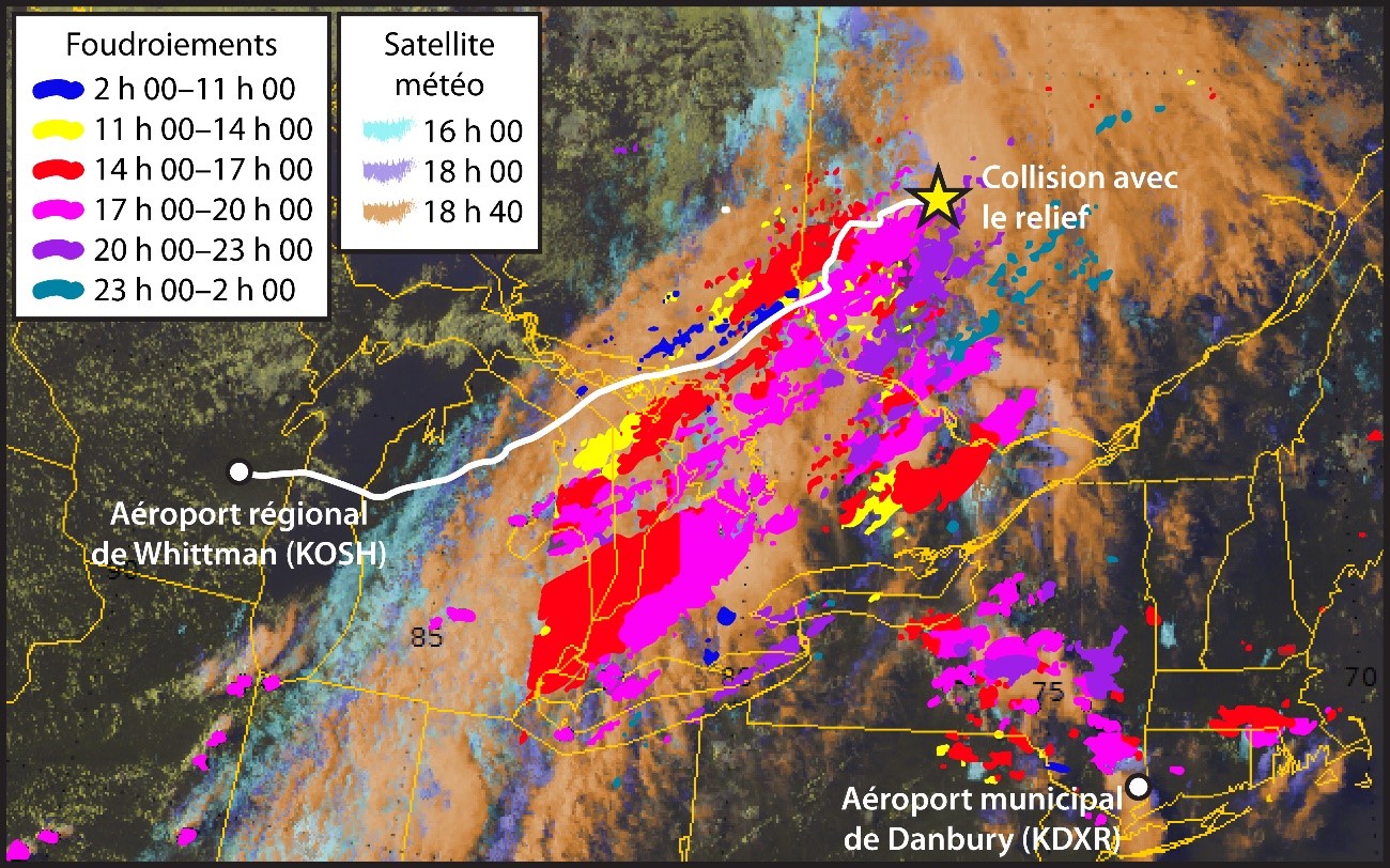 Les nombreuses déviations vers le nord ont toutes été suivies de corrections graduelles pour reprendre une trajectoire vers l’est. Aucune de ces corrections de cap n’a permis de traverser le phénomène météorologique ou de retrouver une trajectoire appropriée vers la destination d’origine, soit l’aéroport municipal de Danbury (KDXR), au Connecticut (États-Unis).