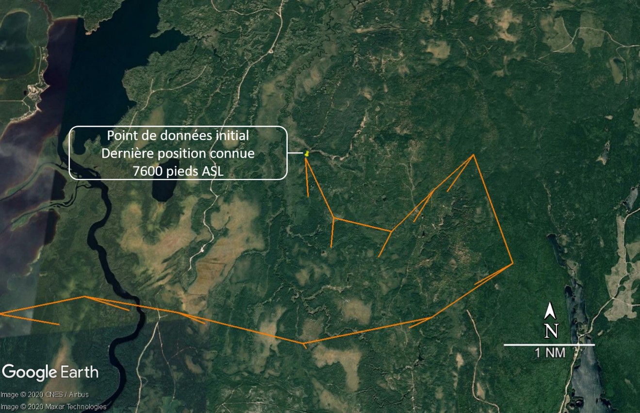 Le JRCC de Trenton a été avisé que l’aéronef avait disparu à 23 h 31 le 29 juillet 2019, et il a lancé son intervention de recherche et de sauvetage. À 00 h 49, le 30 juillet 2019, le JRCC de Trenton a obtenu quelques données initiales du système ADS-B terrestre du Air Force Rescue Coordination Center des États-Unis, qui avait enregistré la position et l’altitude GPS de l’aéronef pour la dernière fois à 19 h 11 min 42 s. Le JRCC de Trenton a utilisé ce point de données pour déterminer la zone de recherche. Ces données initiales correspondaient aux données qui étaient disponibles sur Internet par l’entremise de plusieurs réseaux différents de récepteurs terrestres privés du système ADS-B. Le point de données était à 48° 28′02″N, 077° 03′50″O, à une altitude de 7600 pieds ASL, et se trouvait à 4638 pieds (0,76 NM) du lieu de l’écrasement réel (Figure 5).
