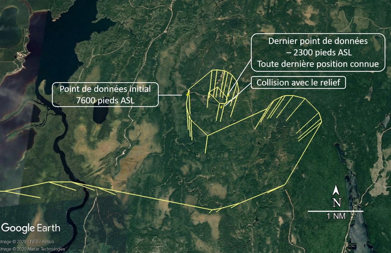 Le dernier point de données a été enregistré à 19 h 12 min 30 s. À ce moment-là, l’aéronef franchissait 2325 pieds ASL en descente, soit environ 1300 pieds AGL. La collision avec le relief s’est probablement produite entre 2 et 3 secondes après le dernier point de données.