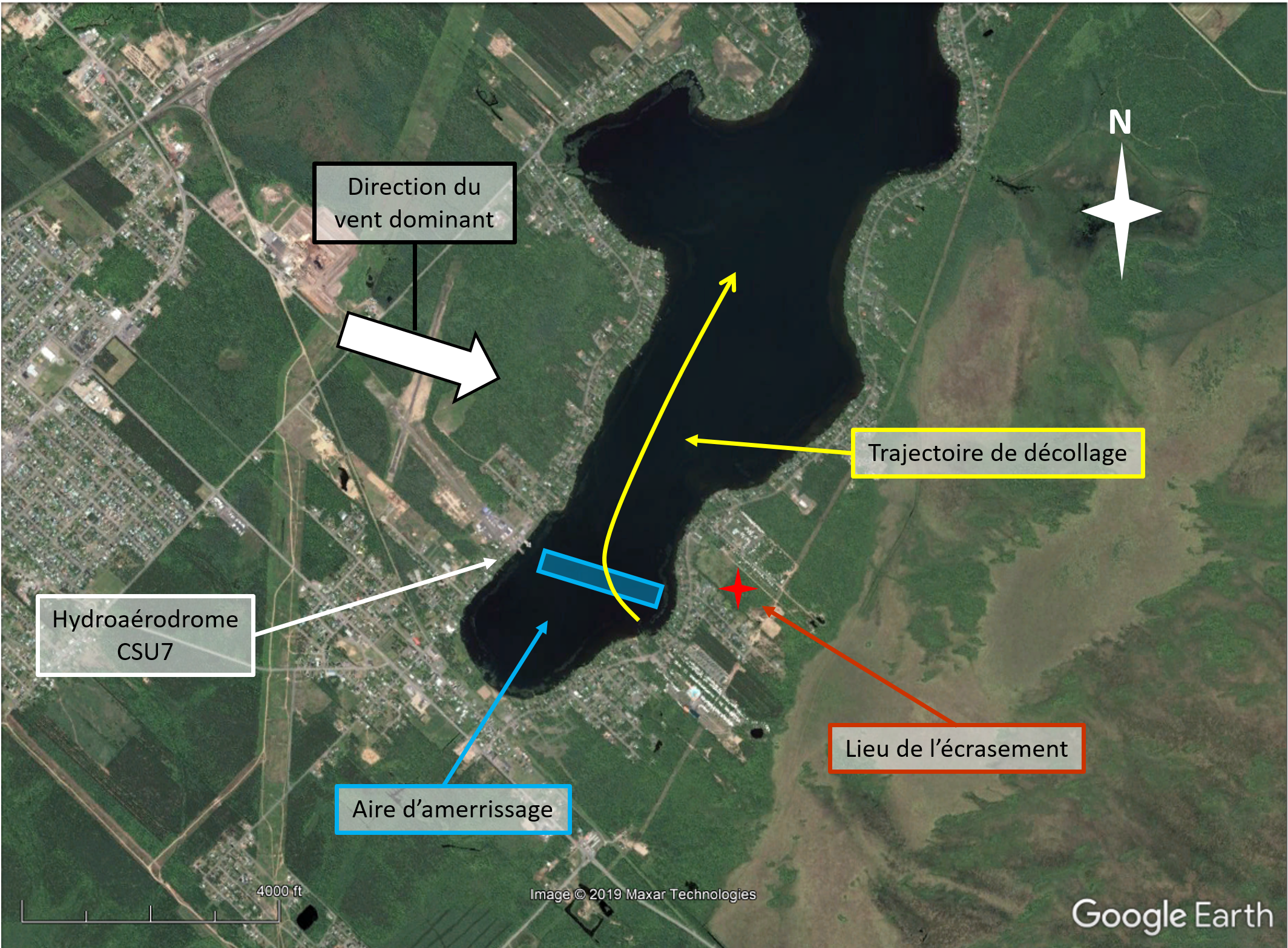 Le pilote a alors effectué ses 2 premiers vols de l’après-midi. Il a décollé en direction nord-est selon une trajectoire lui offrant une plus grande longueur à la surface du lac qu’un décollage complet vent de face (figure 1). Après son trajet habituel, il est revenu se poser en direction nord-ouest, face au vent dominant.