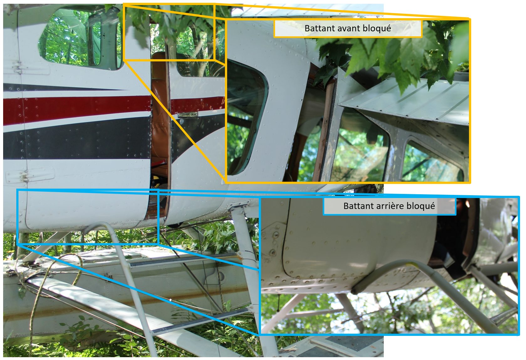 Le battant avant de la porte de soute était partiellement ouvert, et bloqué par les volets baissés. Ce problème propre au Cessna 206 a été relevé et analysé lors de l’enquête A18W0129 du BST et a donné lieu à l’avis de sécurité aérienne A18W0129-D1-A1Note de bas de page 4. Le battant arrière de la porte de soute de l’aéronef à l’étude était fermé et son levier de verrouillage était en position fermée. Les enquêteurs ont tenté d’ouvrir le battant arrière, mais le montant des marchesNote de bas de page 5 avait été déformé vers le haut par l’impact et empêchait l’ouverture du battant (figure 3).