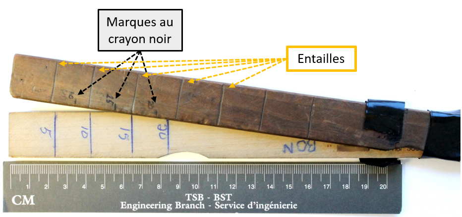 Le bâton qu’utilisait le pilote était double et se composait de 2 bâtons superposés et collés ensemble à une extrémité (figure 4). Le 1er bâton, brun foncé, comportait plusieurs entailles à intervalles réguliers et 3 marques au crayon noir indiquant 10, 15 et 20 gallons, marques qui étaient décalées par rapport aux entailles. Le 2e bâton, plus clair, comportait des lignes au crayon bleu indiquant 5, 10, 15 et 20 gallons et la mention « bon » à son extrémité non graduée (figure 4). Ces marques n’étaient visibles qu’en écartant les 2 bâtons. Les marques au crayon bleu du 2e bâton correspondaient de près aux entailles du 1er bâton. Une comparaison des différentes indications a révélé que les marques au crayon noir semblaient indiquer des quantités d’environ 2,5 gallons supérieures aux quantités indiquées par les autres graduations.