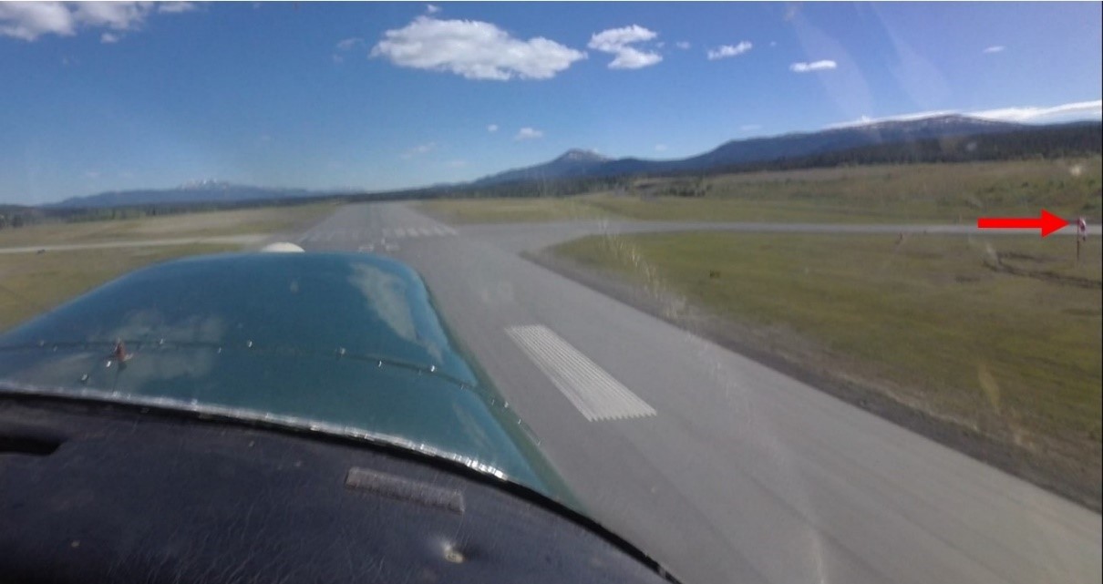 À 3400 pieds de l’extrémité de la piste, le pilote aux commandes a sorti les volets, de 0° à 40°. À 2900 pieds de l’extrémité de la piste, le pilote a rentré quelque peu les volets à 30° ou à 20° et a maintenu ce réglage; l’enquête n’a pas permis de déterminer le réglage précis. À 2300 pieds de l’extrémité de la piste, l’avion a traversé une zone d’accalmie indiquée par la manche à air flasque (figure 2).