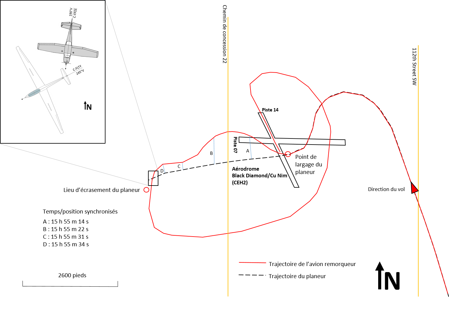 À 15 h 55, alors que les aéronefs se trouvaient à 0,5 mille marin (NM) au sud-ouest du seuil de la piste 07 et à une altitude d’environ 6075 pieds ASL, l’hélice de l’avion remorqueur a percuté l’empennage de queue du planeur. En tout, 34 secondes s’étaient écoulées entre le largage du planeur et la collision.