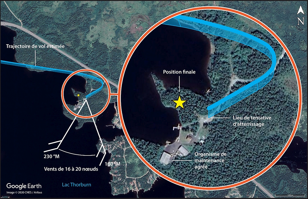 En cours de vol, les pilotes des 2 hélicoptères ont effectué plusieurs arrêts en route en raison du brouillard au sol le long de la côte sud du Labrador, et ils prévoyaient s’avitailler à l’aérodrome de Springdale (CCD2) (Terre-Neuve-et-Labrador). Cependant, après avoir atterri à CCD2, ils ont constaté que le service d’avitaillement ne serait pas disponible avant plusieurs heures. Les pilotes connaissaient un organisme de maintenance agréé (OMA) situé sur la rive est du lac Thorburn, de l’autre côté du lac par rapport à l’hydrobase de Thorburn Lake (CCW5) (Terre-Neuve-et-Labrador). Le pilote de l’événement à l’étude a communiqué avec l’OMA par téléphone et a confirmé que du carburant était disponible sur place. À 14 h 25Note de bas de page 1, les 2 hélicoptères ont quitté CCD2 en direction de CCW5, situé à environ 110 NM au sud-est.