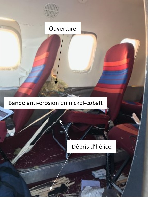 Les bandes anti-érosion en nickel-cobalt et les débris de bois des pales de l’hélice, projetés à grande vitesse, ont pénétré le panneau de renforcement, le revêtement du fuselage et la paroi de la cabine, ce qui a causé des blessures graves à un passager assis à côté de la paroi perforée de la cabine.