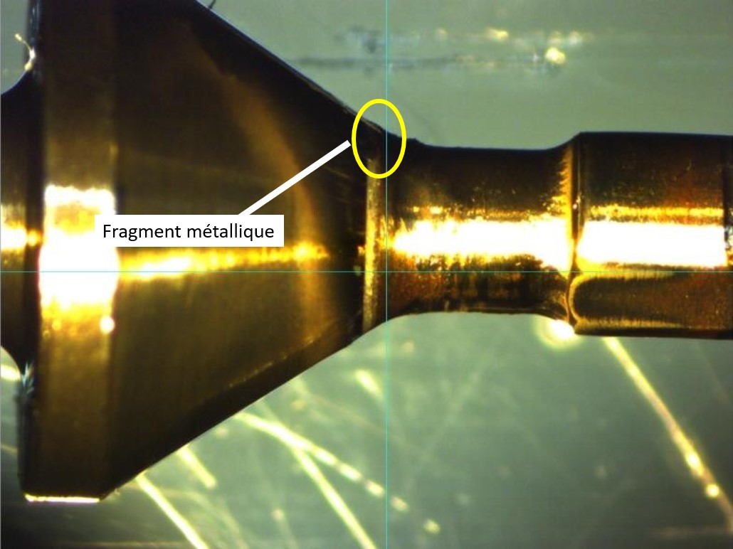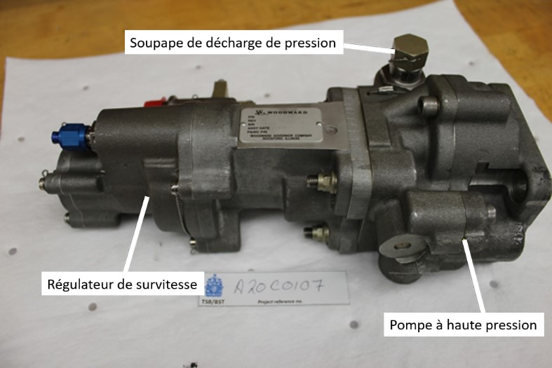 Une contamination métallique d’une source indéterminée a été trouvée dans la soupape de décharge de pression de la pompe à haute pression; cela a empêché la soupape d’être étanche. L’obstruction du joint d’étanchéité a diminué la pression de sortie de la pompe à haute pression, en plus de réduire la capacité de la PCU à contrôler le pas de l’hélice.