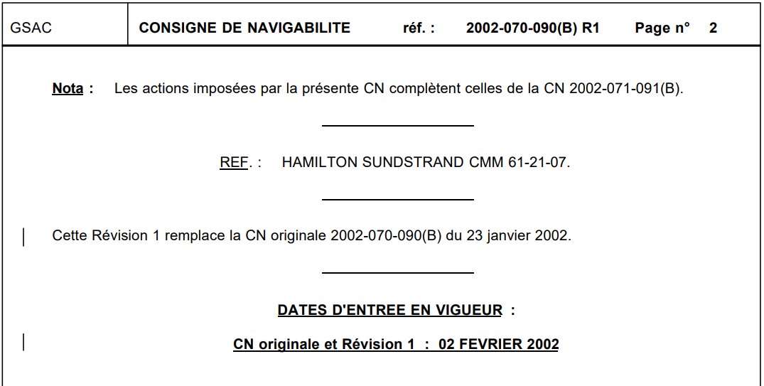 Source : Direction générale de l’aviation civile, Consigne de navigabilité CN 2002-070-090(B) R1 : Avions ATR 42 – Hélices – Système de changement de pas (ATA 61) (publiée le 15 mai 2002).