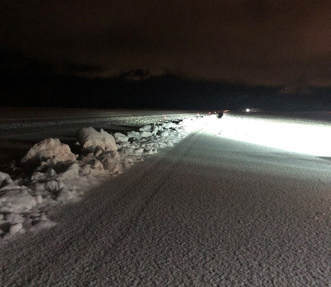 L’approche finale a été effectuée dans l’obscurité, avec des vents variables et des visibilités limitées. À mesure que l’aéronef descendait sous les 200 pieds AGL en approche, les vents variaient entre 6 et 12 nœuds et de 290°M à 020°MNote de bas de page 19. La chute de neige avait augmenté en intensité et le spécialiste de la FSS a estimé la visibilité à 5/8 SM. En raison de la faible visibilité, seuls quelques-uns des feux de bord de piste étaient visibles. Toute la piste était recouverte de neige, y compris toutes les marques de piste, comme les numéros de piste, les marques de seuil de piste, les marques de zone de poser et les marques d’axe de piste.