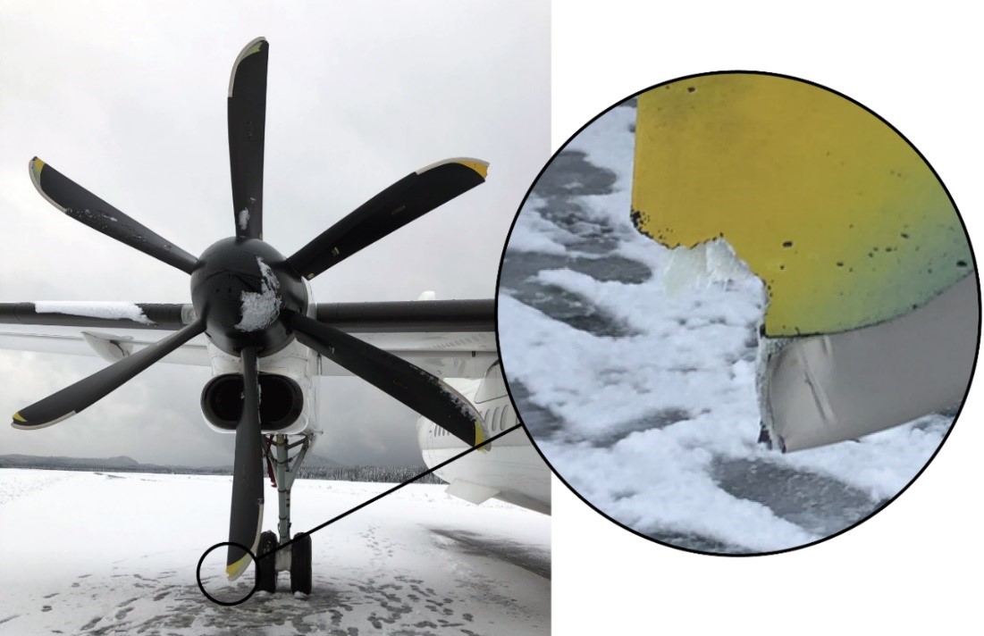 - Pendant la sortie de piste, le logement du train d’atterrissage avant s’est rempli de glace et de neige, ce qui a causé une déformation structurale. Par conséquent, le train d’atterrissage avant n’était plus maintenu en place, et il s’est affaissé vers l’arrière dans le fuselage, ce qui a causé des dommages importants à l’aéronef.