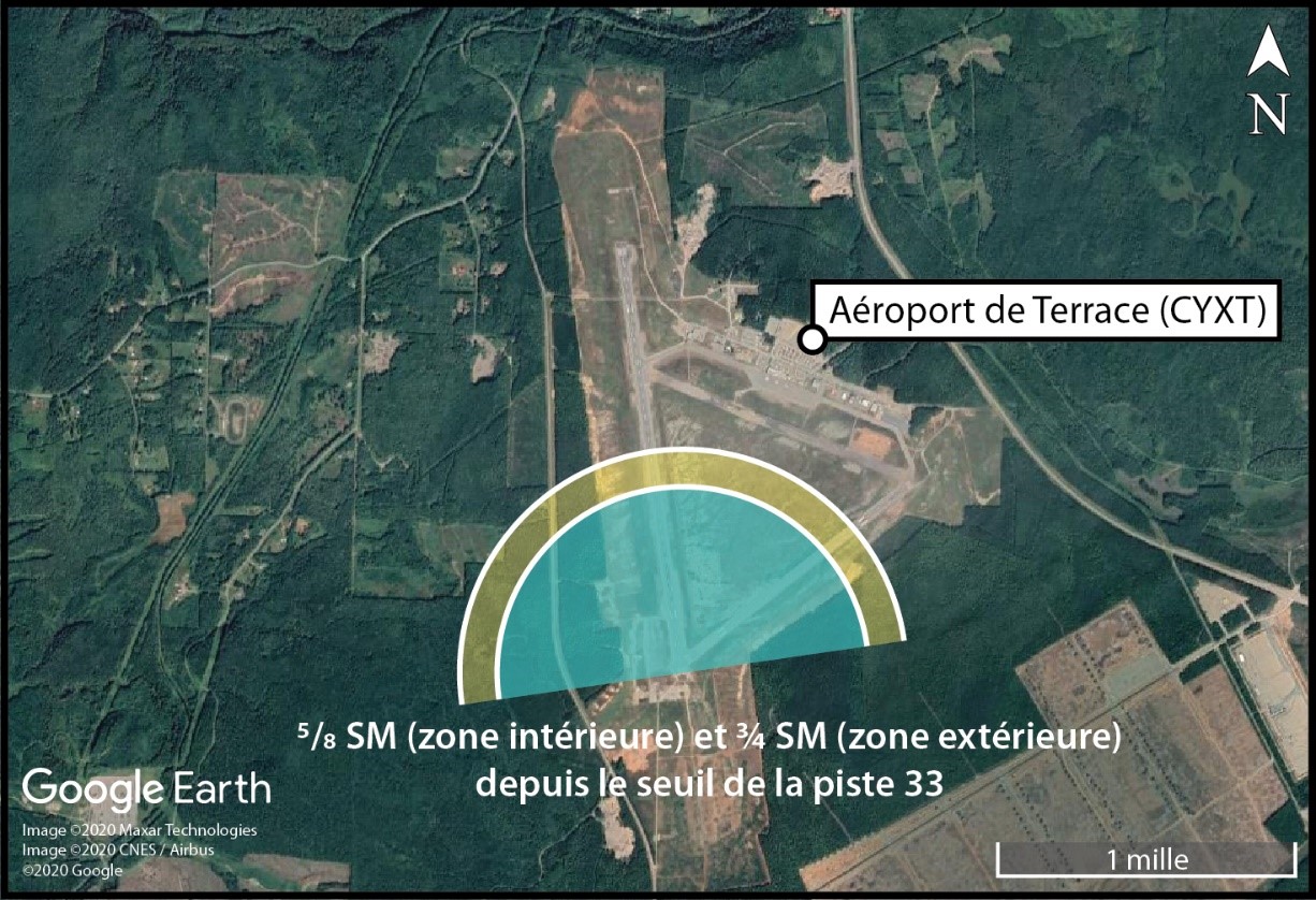 Le 31 janvier 2020, un aéronef DHC-8-402 de De Havilland Aircraft of Canada Ltd. (immatriculation C-FKWE, numéro de série 4467) exploité par WestJet Encore Ltd. effectuait le vol WEN3107 de l’aéroport international de Vancouver (Colombie-Britannique) jusqu’à l’aéroport de Terrace (Colombie-Britannique) avec à son bord 4 membres d’équipage et 43 passagers. À 21 h 06, heure normale du Pacifique, pendant la course à l’atterrissage sur la piste 33, l’aéronef a dérivé vers la gauche depuis la zone déneigée de la piste, et le train d’atterrissage principal gauche est entré en contact avec un andain. En conséquence, l’aéronef a été tiré vers la gauche; le train d’atterrissage avant et le train d’atterrissage principal droit sont également entrés en contact avec l’andain. L’aéronef a roulé dans la zone de la piste qui n’était pas déneigée, et le train d’atterrissage principal gauche a quitté la surface de la piste, au-delà des feux de bord de piste. L’aéronef a ainsi parcouru une distance d’environ 400 pieds avant de regagner la piste. Pendant la sortie de piste, en traversant l’andain et la zone de la piste qui n’était pas déneigée, le train d’atterrissage avant de l’aéronef s’est affaissé vers l’arrière. Après l’immobilisation de l’aéronef, l’équipage de conduite a demandé l’intervention des services de sauvetage et de lutte contre les incendies d’aéronefs. Il n’y a eu aucun blessé. Les passagers ont été transportés à l’aérogare par autobus environ 30 minutes après l’atterrissage. Les dommages à l’aéronef comprenaient l’affaissement du train d’atterrissage avant ainsi que des dommages aux pales de l’hélice droite. L’accident s’est produit durant les heures d’obscurité, par visibilité limitée en raison d’une chute de neige.