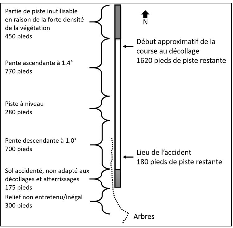 L’aérodrome abandonné du lac Stave est situé à 20 NM au nord de Mission, à une altitude de 350 pieds au-dessus du niveau de la mer (ASL). La longueur de la bande d’atterrissage en gravier est d’environ 2375 pieds et sa largeur est de 50 pieds, avec une longueur utile d’environ 1750 pieds orientée nord-sud (figure 2). Les premiers 450 pieds de l’extrémité nord de la piste ne peuvent pas être utilisés en raison de la densité de la végétation, et les derniers 175 pieds de l’extrémité sud de la piste sont accidentés. À 300 pieds au-delà de l’extrémité sud de la piste, des arbres s’élèvent à quelque 80 pieds de hauteur. Pour les aéronefs qui décollent en direction sud, la pente monte selon un angle de 1,4° sur 770 pieds, reste à niveau sur 280 pieds, puis descend selon un angle de 1,0° sur 700 pieds.